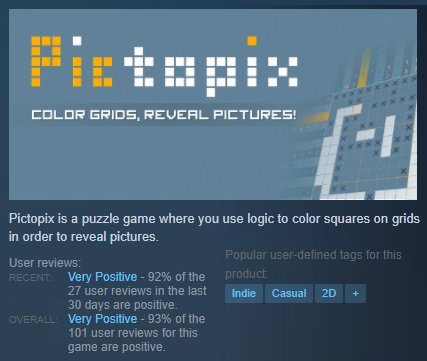 Un petit mot vite fait pour dire que Pictopix est en promo ce week-end. Si le jeu est déjà dans votre wishlist, Steam a dû vous envoyer un mail :