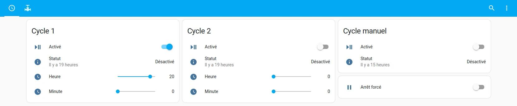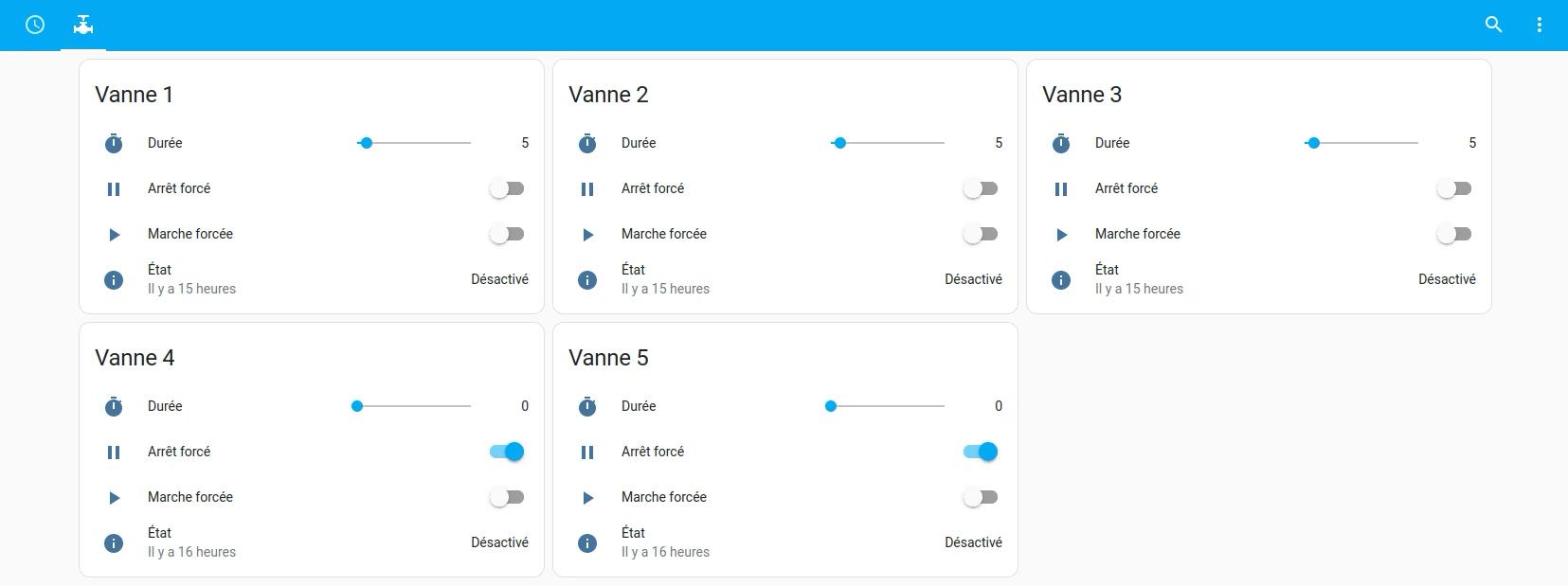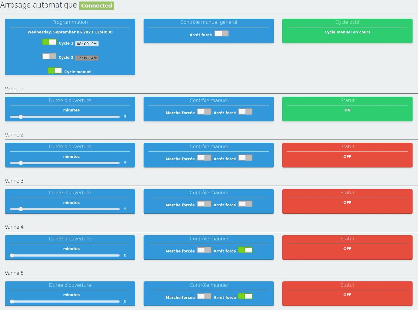 L’interface web permet à ce jour de configurer uniquement les cycles d’arrosage et de commander les vannes manuellement.