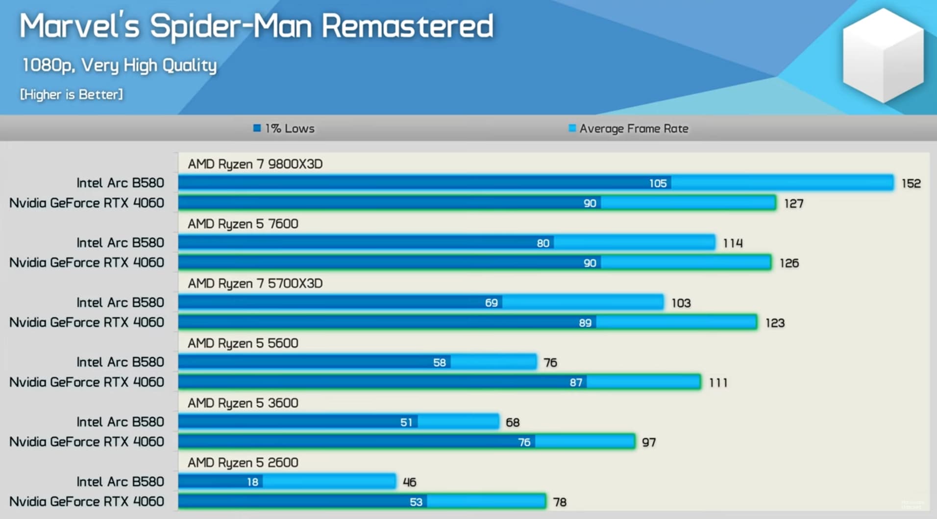 Malheureusement de nouveaux tests montrent que la B580 est une carte qui actuellement nécessite plus de puissance CPU que la RTX 4060 pour pleinement s’exprimer :
