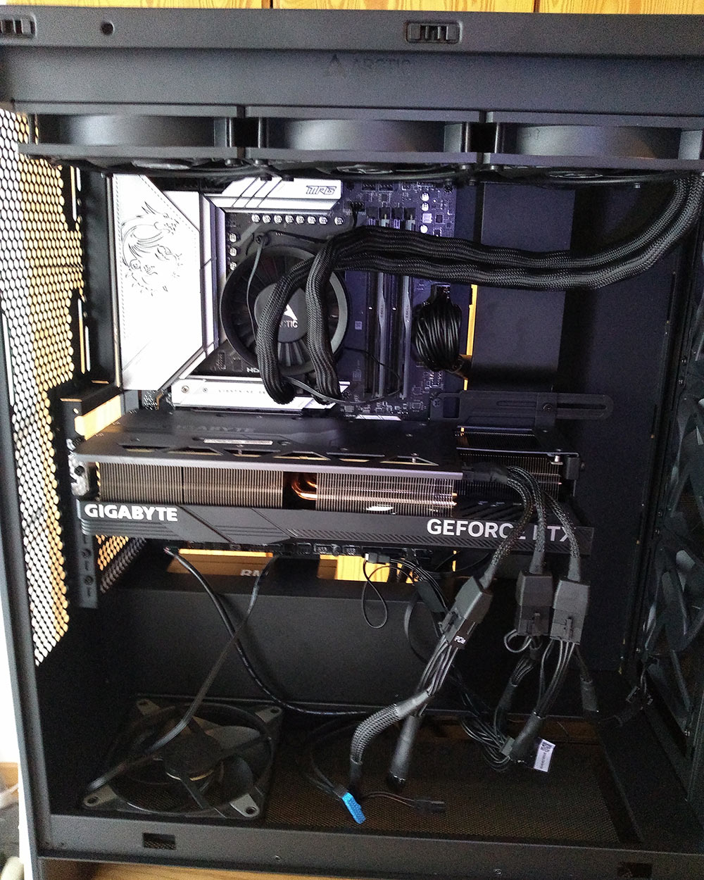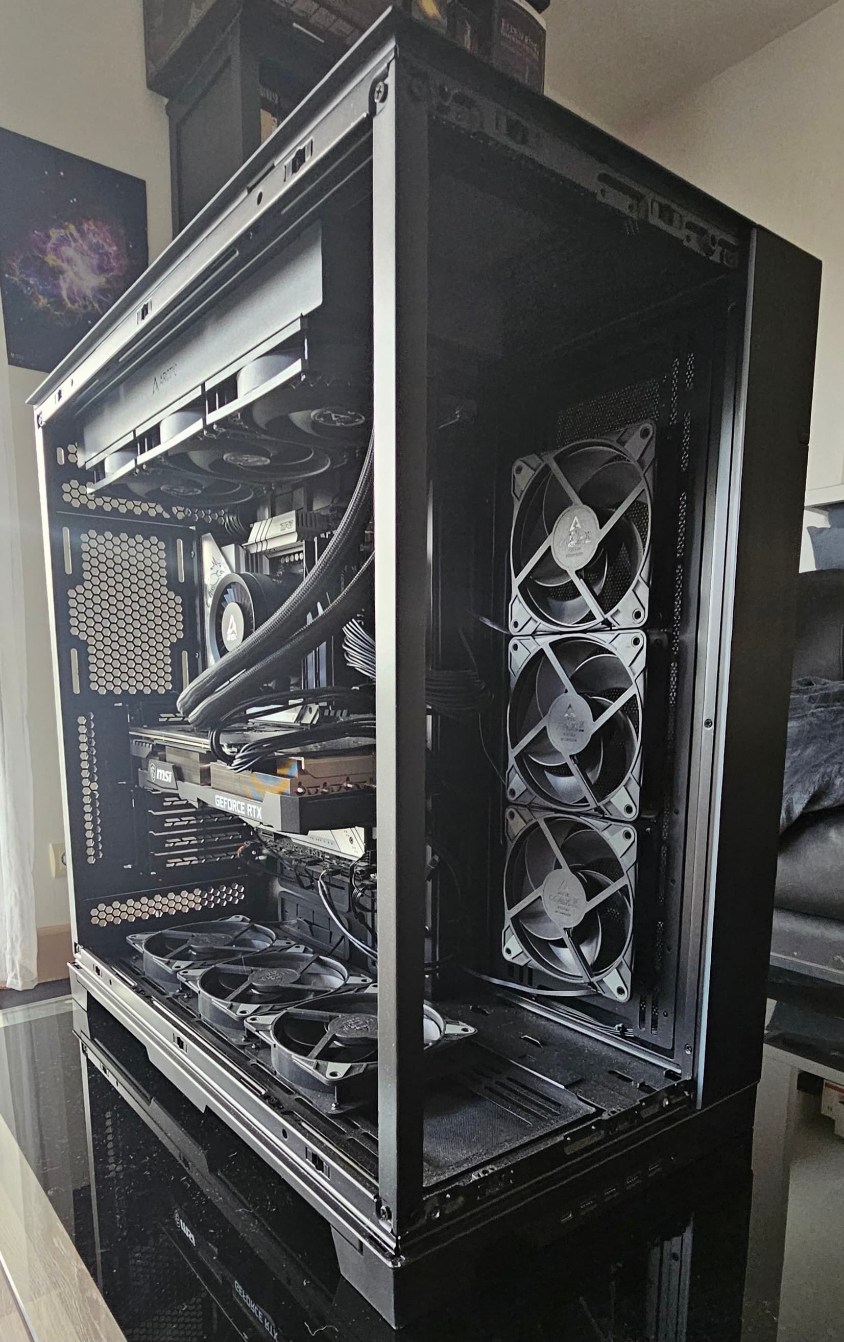 Six ventilos plus le bloc, deux disques SATA, trois disques M.2, et la dernière RTX4080S sur laquelle la main de l’homme aura pu mettre le doigt. Le cable management est déplorable, et le restera.