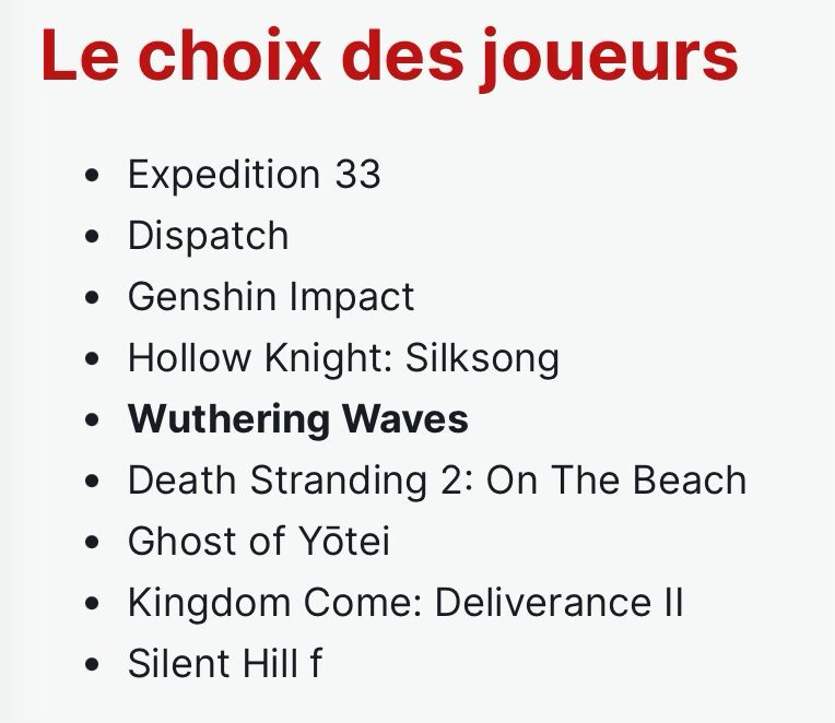 Visiblement le prix est trusté chaque année par le gacha du moment qui promet monts et merveilles à ses joueurs si ceux-ci votent en masse aux GA pour lui faire gagner ledit prix. Genre les 2 dernières années Genshin Impact avait gagné devant des mastodontes comme Elden Ring ou BG3.