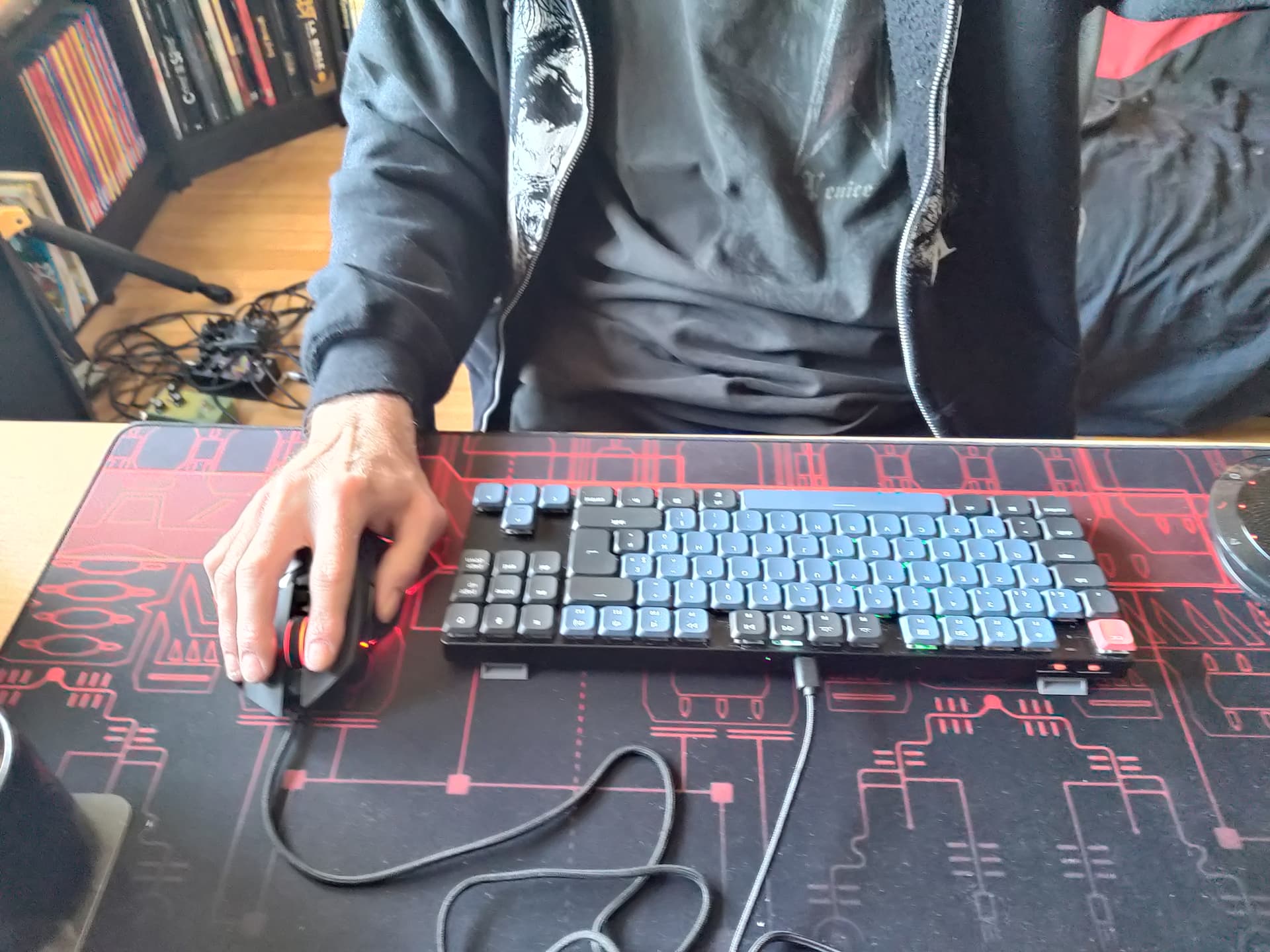 Pour illustrer mon clavier, la configuration classique c’est centré devant moi. Donc aucun soucis pour écrire. Et la souris est placé juste à droite dans l’alignement du bras. Une photo à l’arrache.