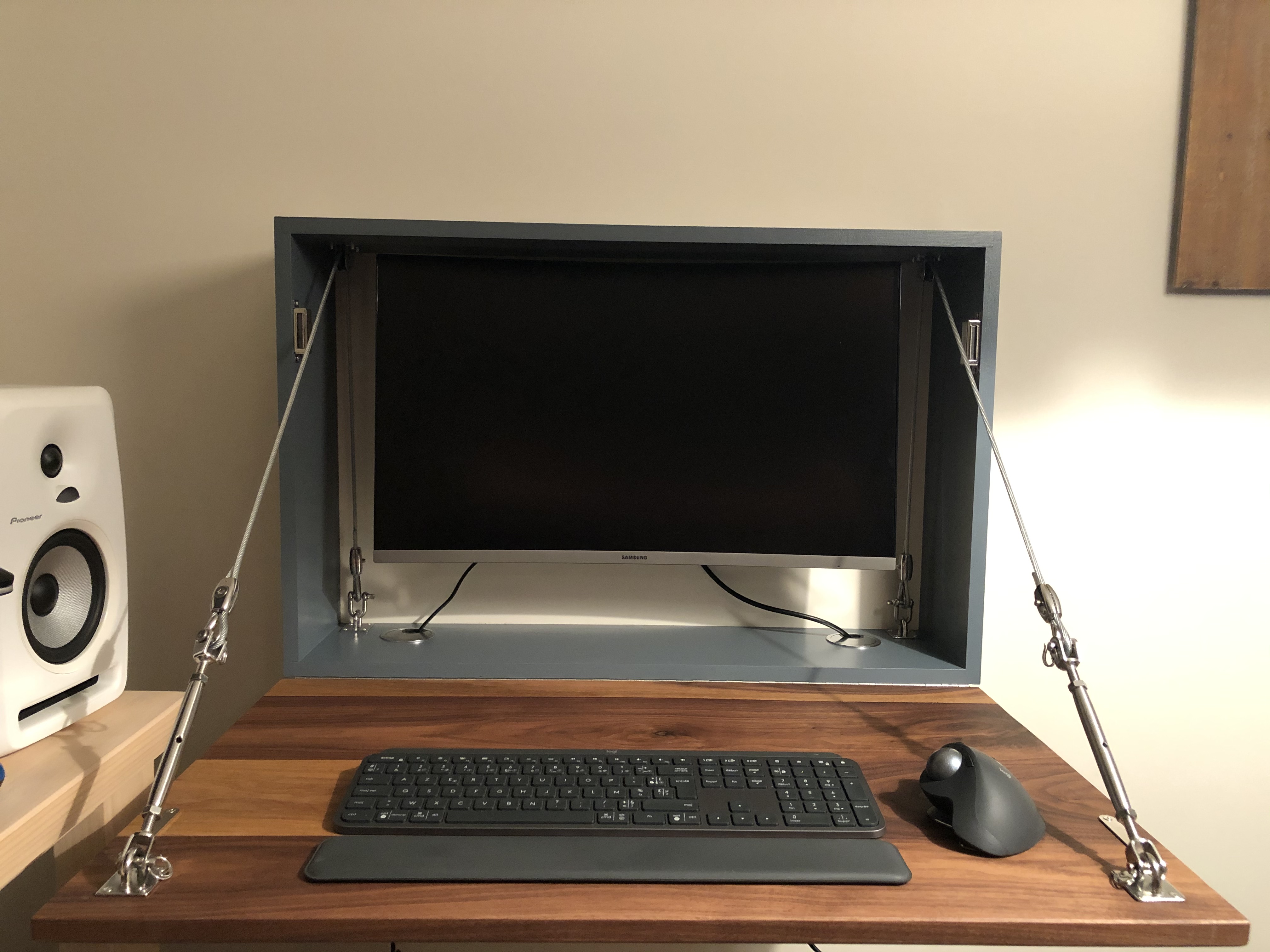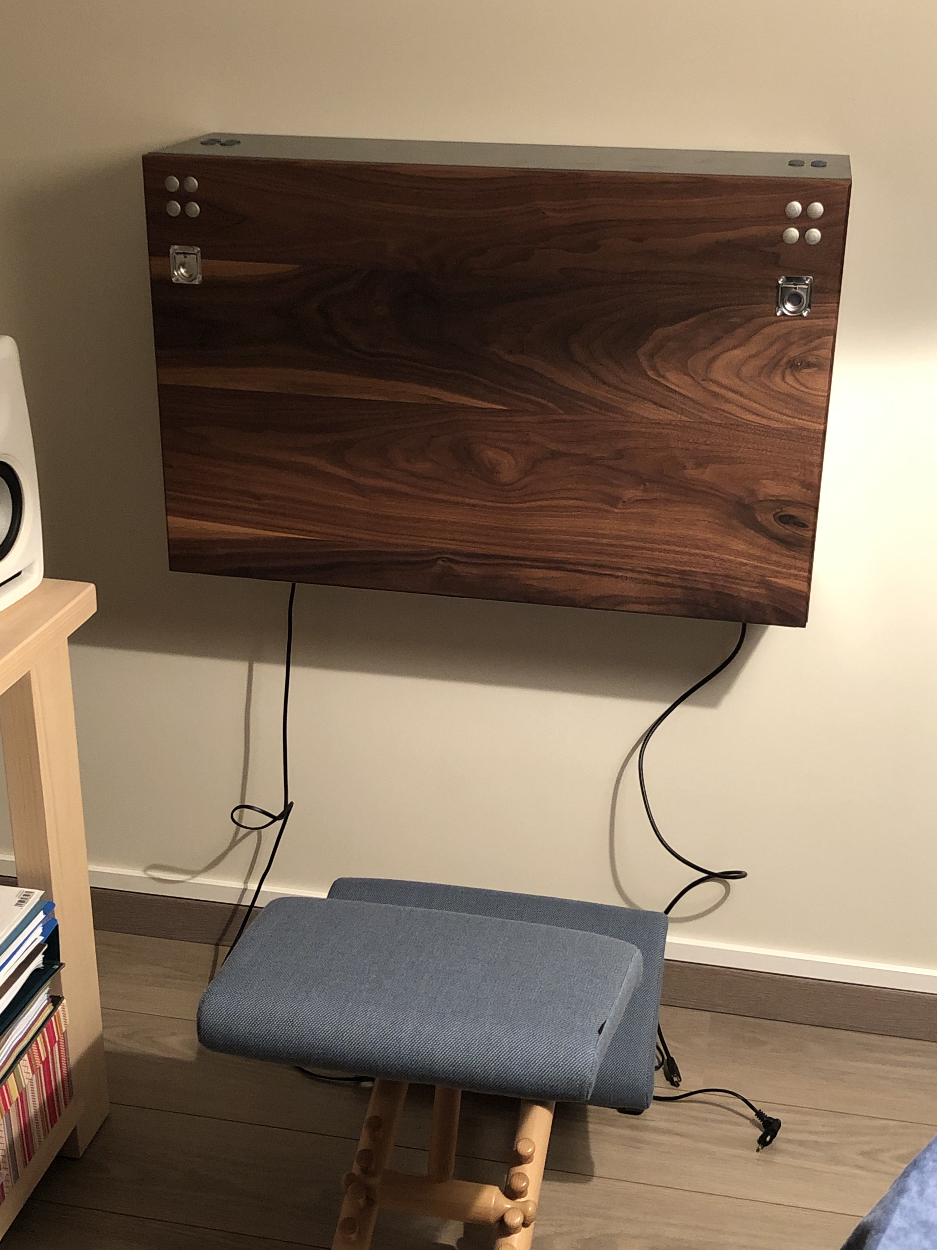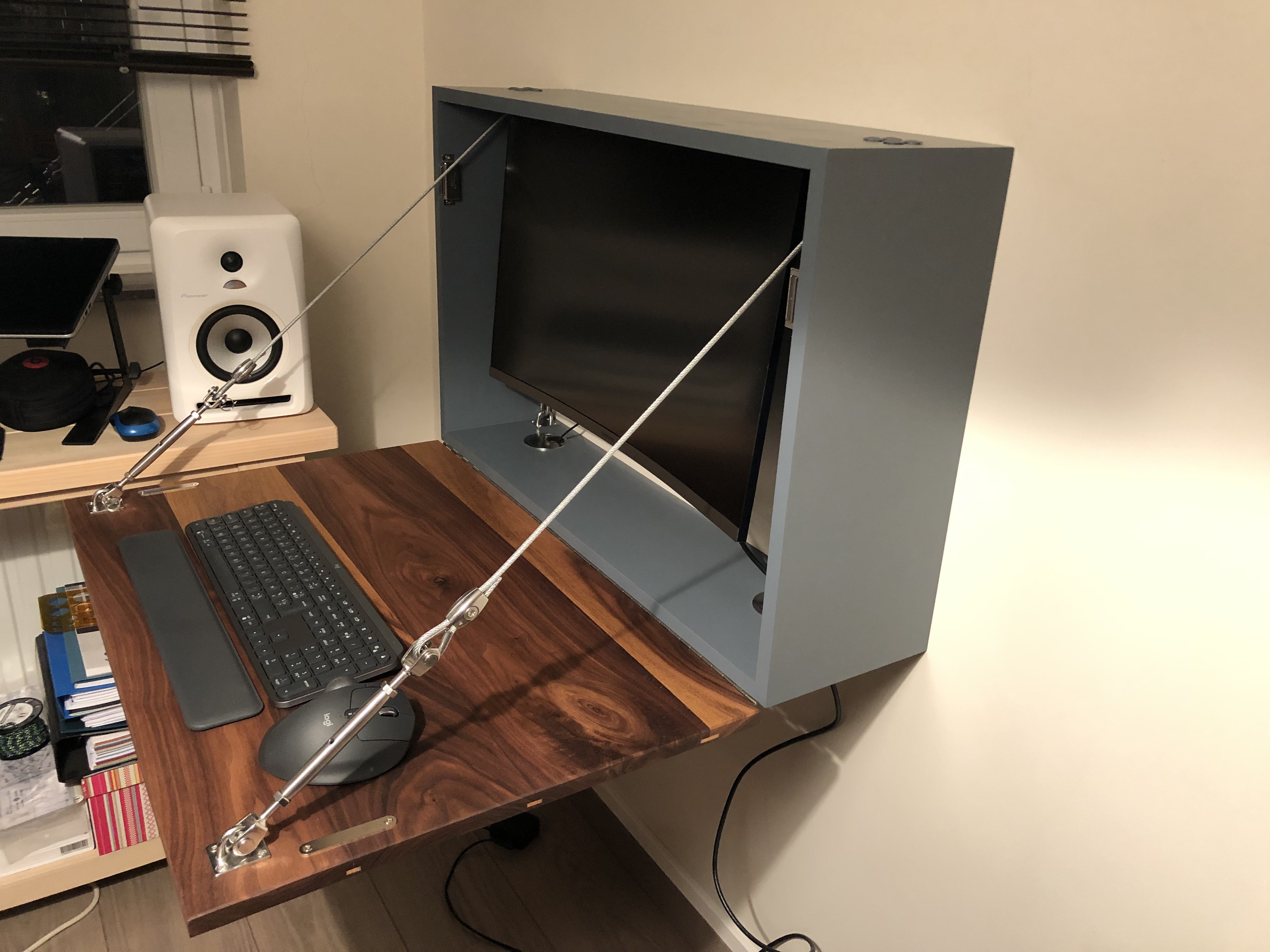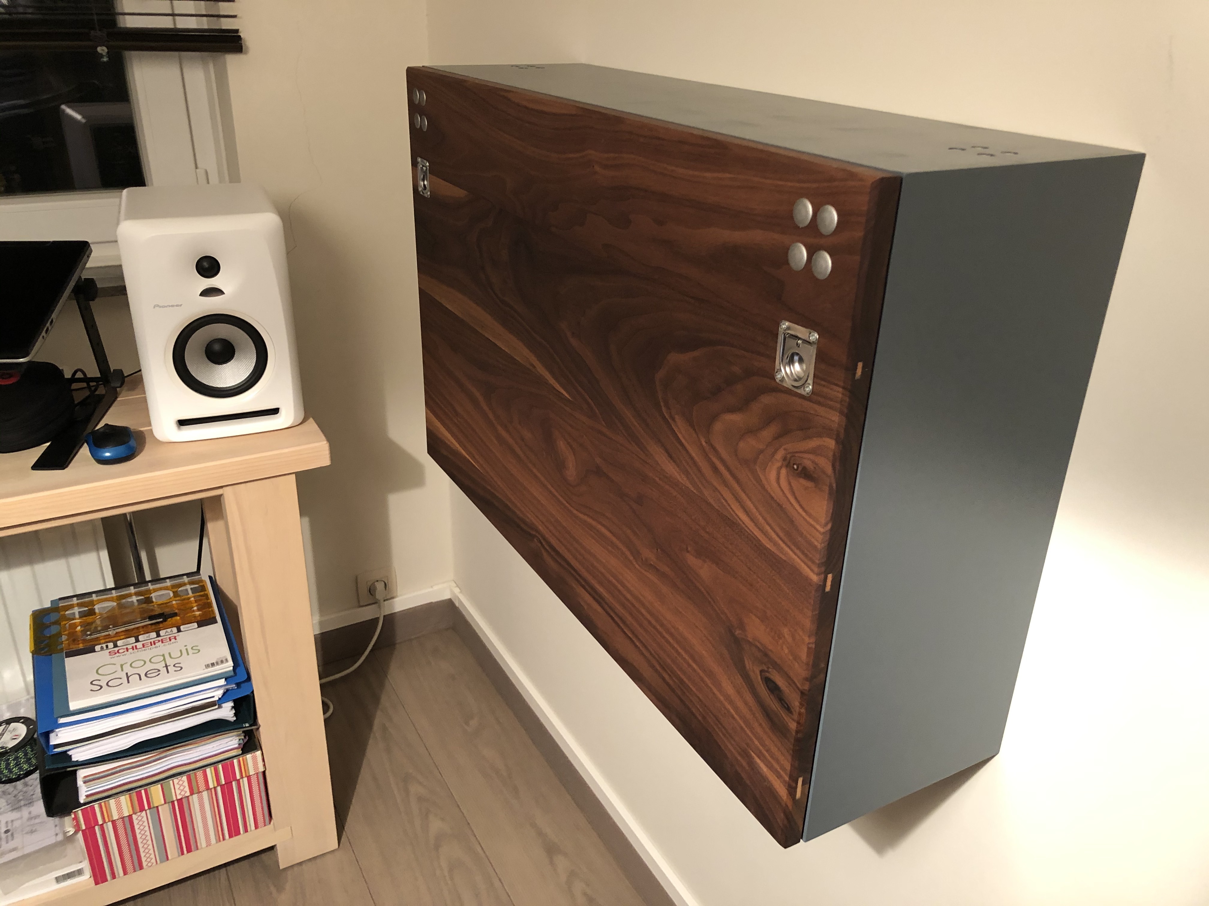 Sinon dans un style très différent, on vient de terminer le bureau escamotable d’un ami. On a pris des pièces de bâteau pour une partie de la quincaillerie car c’est sa passion. Cadre en contreplaqué peint (idem pour le fond qu’on ne voit pas car il est peint dans la couleur du mur) et table en noyer fini au Rubio.