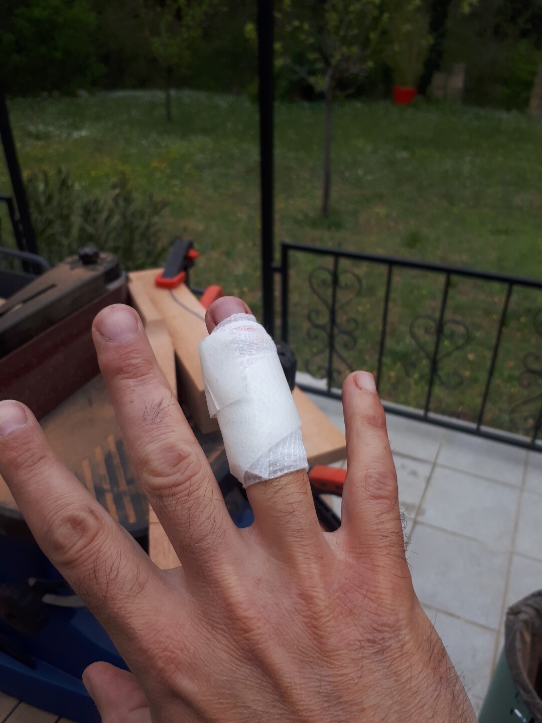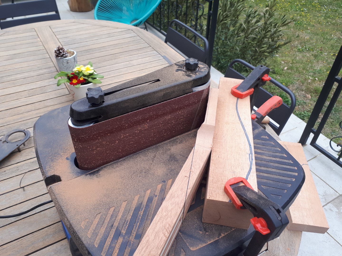 Ingénieux, efficace… Sauf que la bande tourne dans le sens inverse des aiguilles d’une montre… et donc le bois a été avalé et la main qui le tenait a été bien entrainée sur la bande (grain 80, tant qu’a faire ^^).