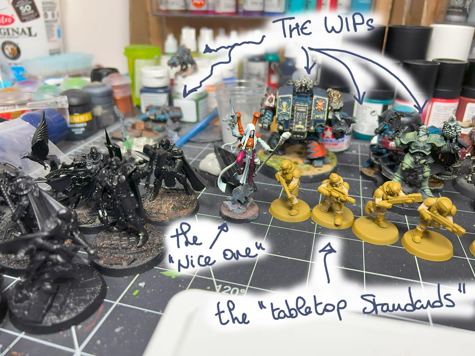 J’ai donc pris une petite photo de ce que j’ai en cours, avec les Stormcasts en cours, des gardes impériaux de chez Station Forge, les Marines-presques-fini-me-reste-juste-quelques-touches, et un Harlequin (2nd hand) que j’ai fait en mode yolo, et j’aime pas du tout le résultat du orange, donc je laisse mijoter histoire de trouver une solution.