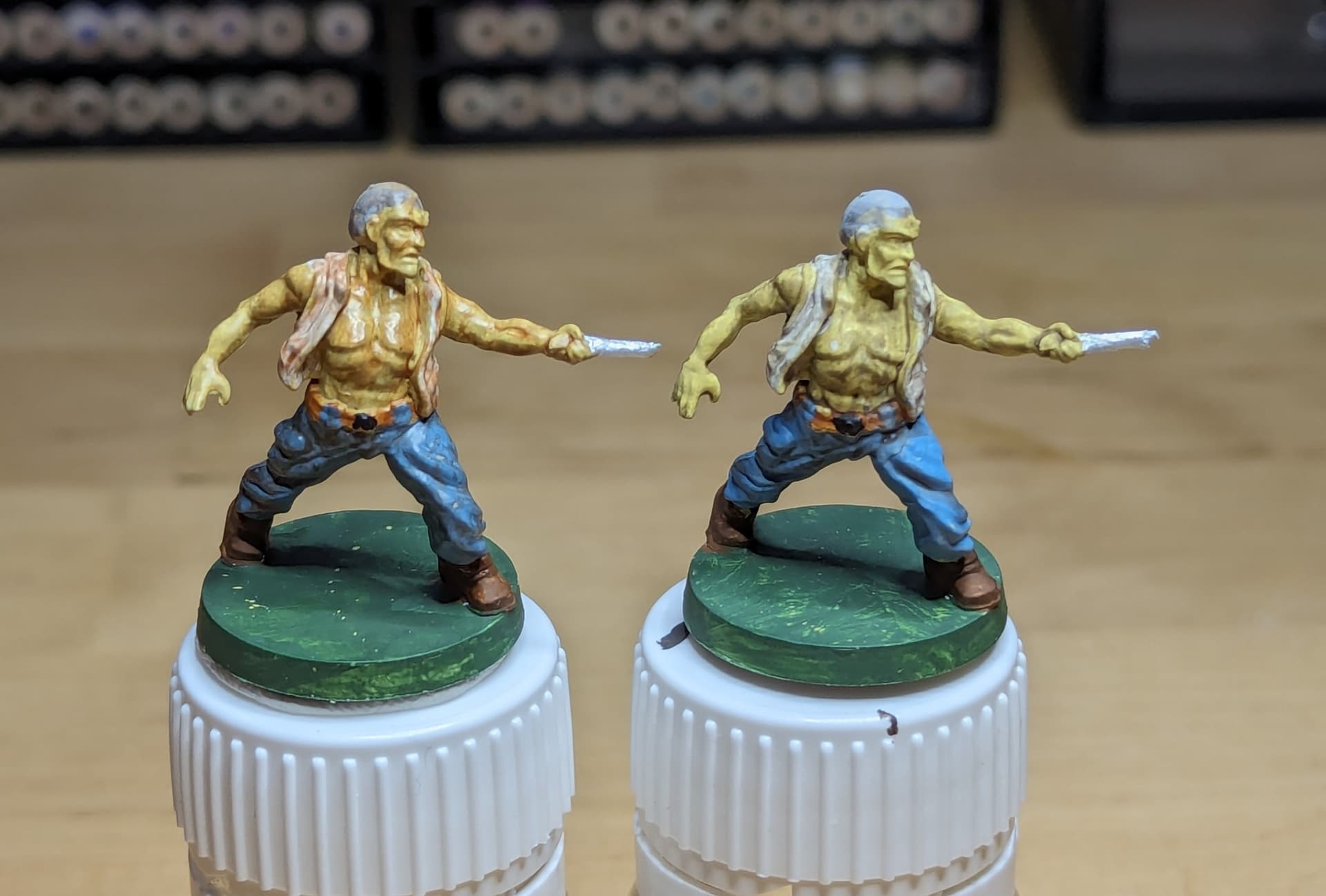Et finalement, tu peux aussi les diluer un peu, de la meme manière qu’on dilue la peinture acrylique. Les washes sont généralement pas super fan des grandes zones plates, avec tendance à faire des petites flaques (on parle alors de « pooling ») au milieu d’un gros truc, alors que tu voudrais que ça aille juste dans les creux.