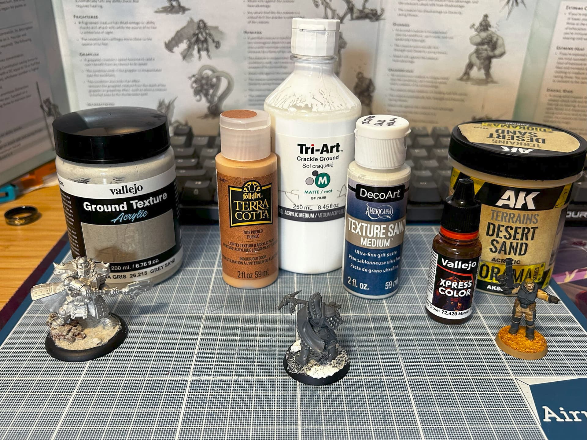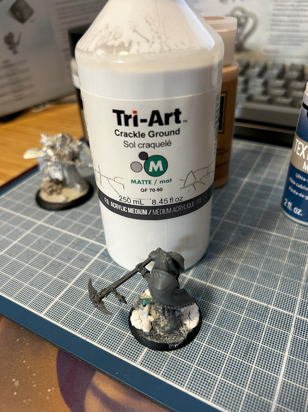 Après j’ai accumulé pas mal de trucs spécialisés en 2-3 ans (avoir des magasins d’art & craft à 5 et 10 minutes à pied: une bénédiction et une malédiction dans un seul package), donc j’ai aussi du medium à craqueler pour faire les effets d’au dessus, et quelques acrylic texture pastes de chez Vallejo ou AK histoire de viser quelques finish spécifiques.