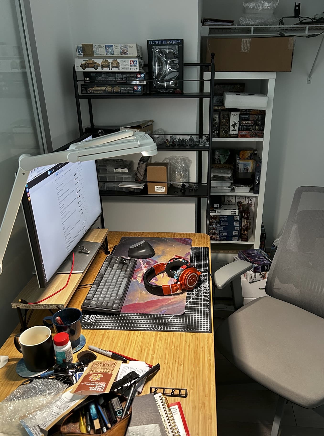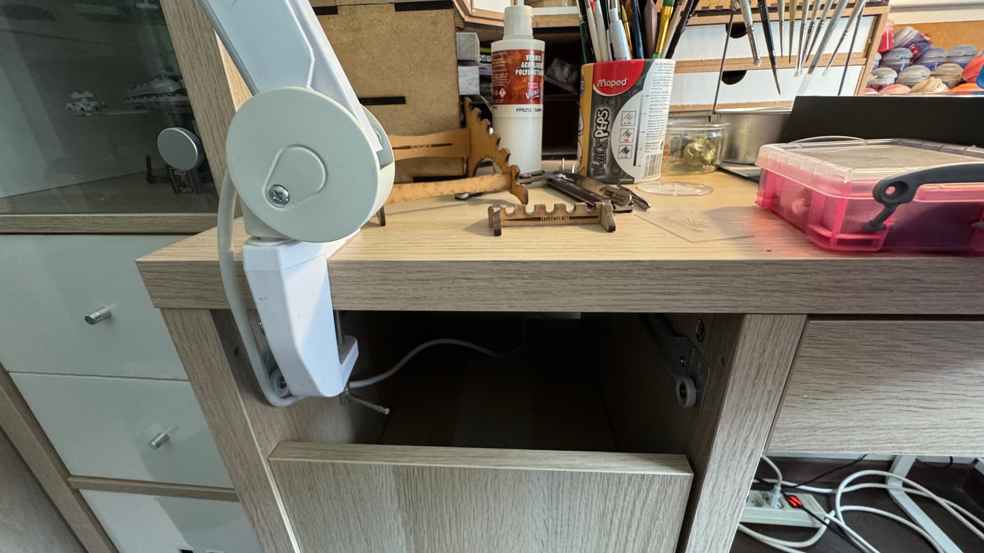nouvel appart, nouvelle disposition, pas les memes opportunitees qu’avant, donc il faut etre malin. Je me suis fait de quoi ranger le clavier sous l’ecran, et je me suis pris une nouvelle lampe (GameEnvy Lucent).