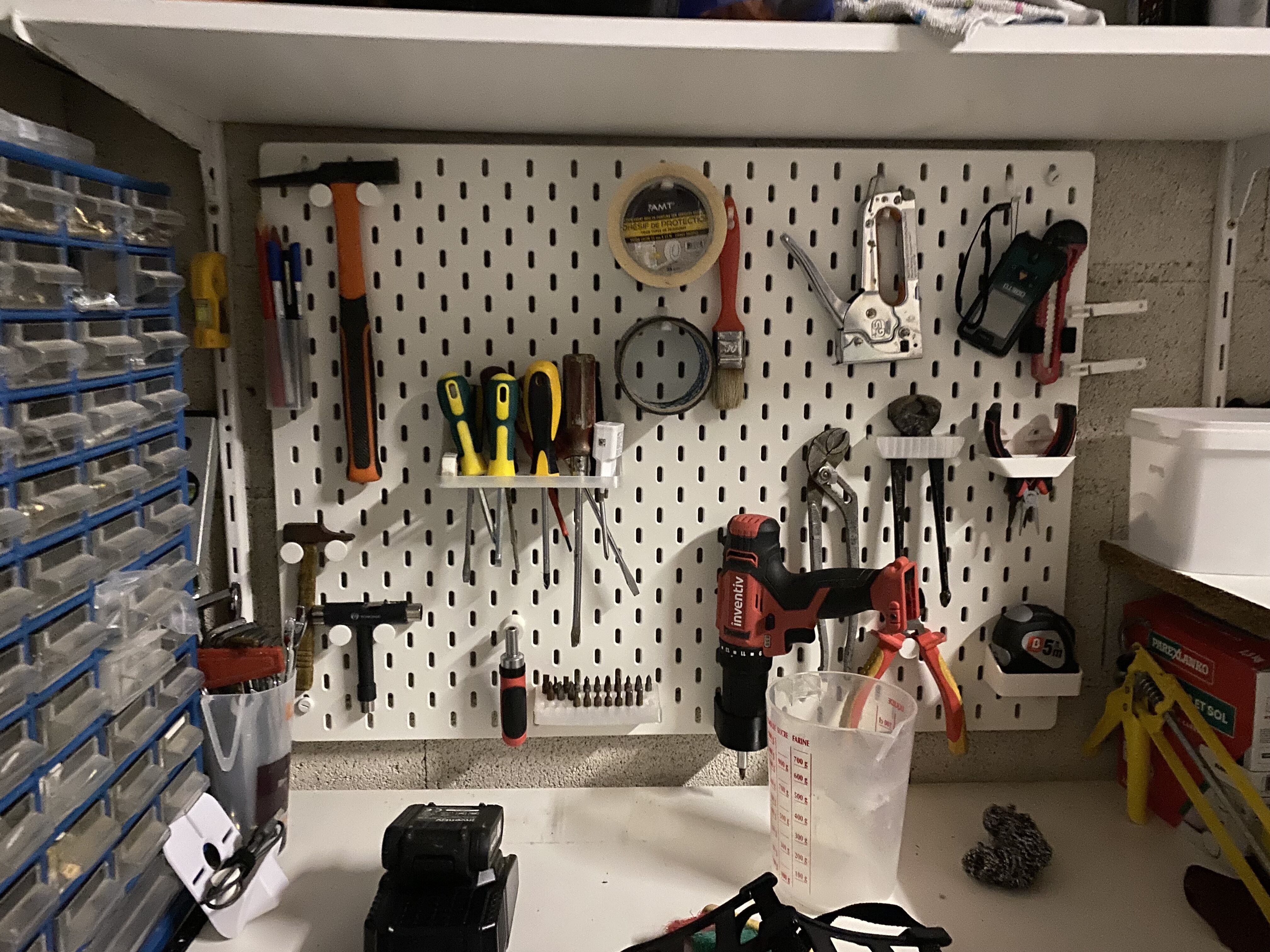 J’ai trébuché sévère sur les modules pour skadis j’ai passé la matinée à ranger mon garage pour ensuite pouvoir vider mes étagères/établis, installer une skadis, découper une de mes planches d’établis, tout bouger et tout puis imprimer des modules et commencer à tout ranger.