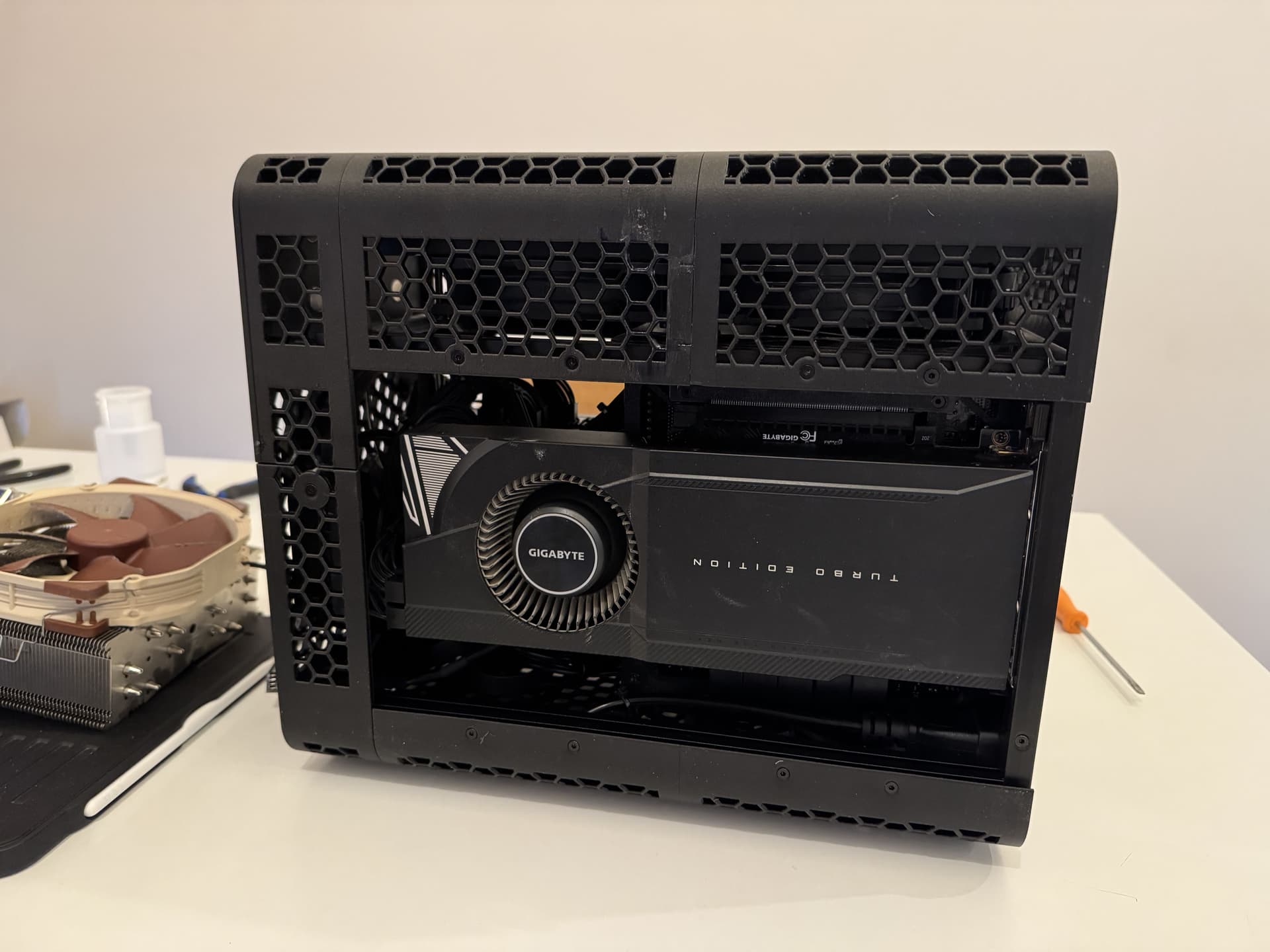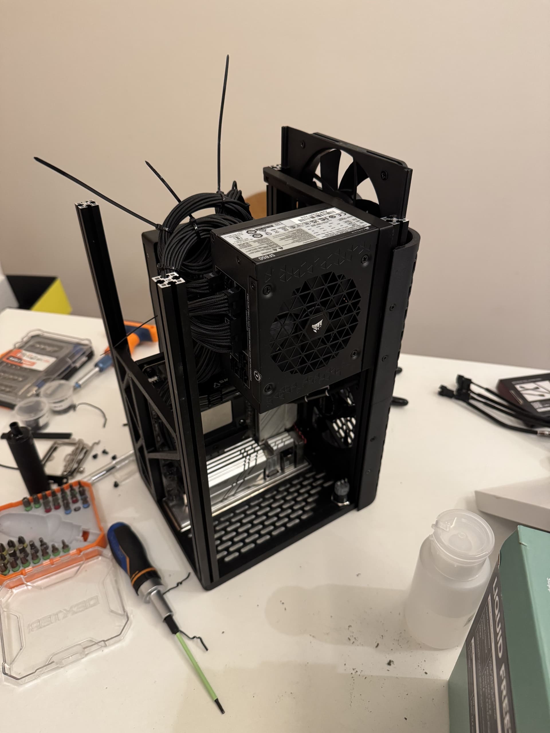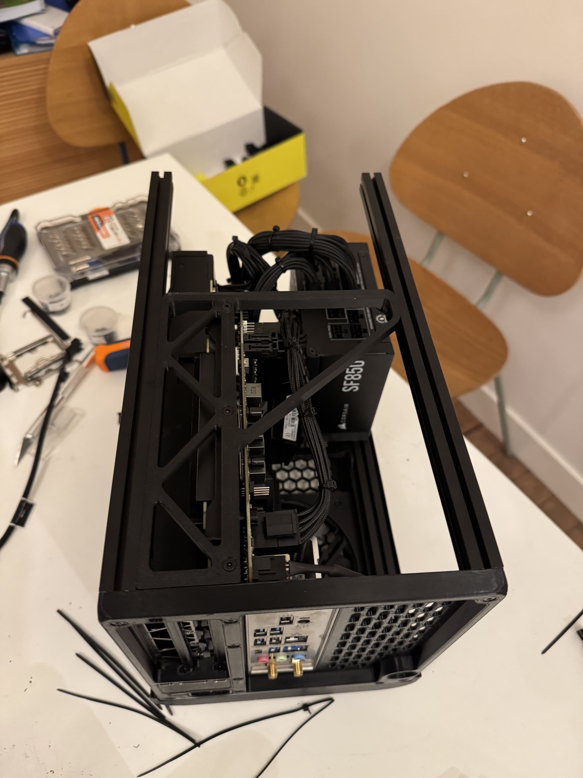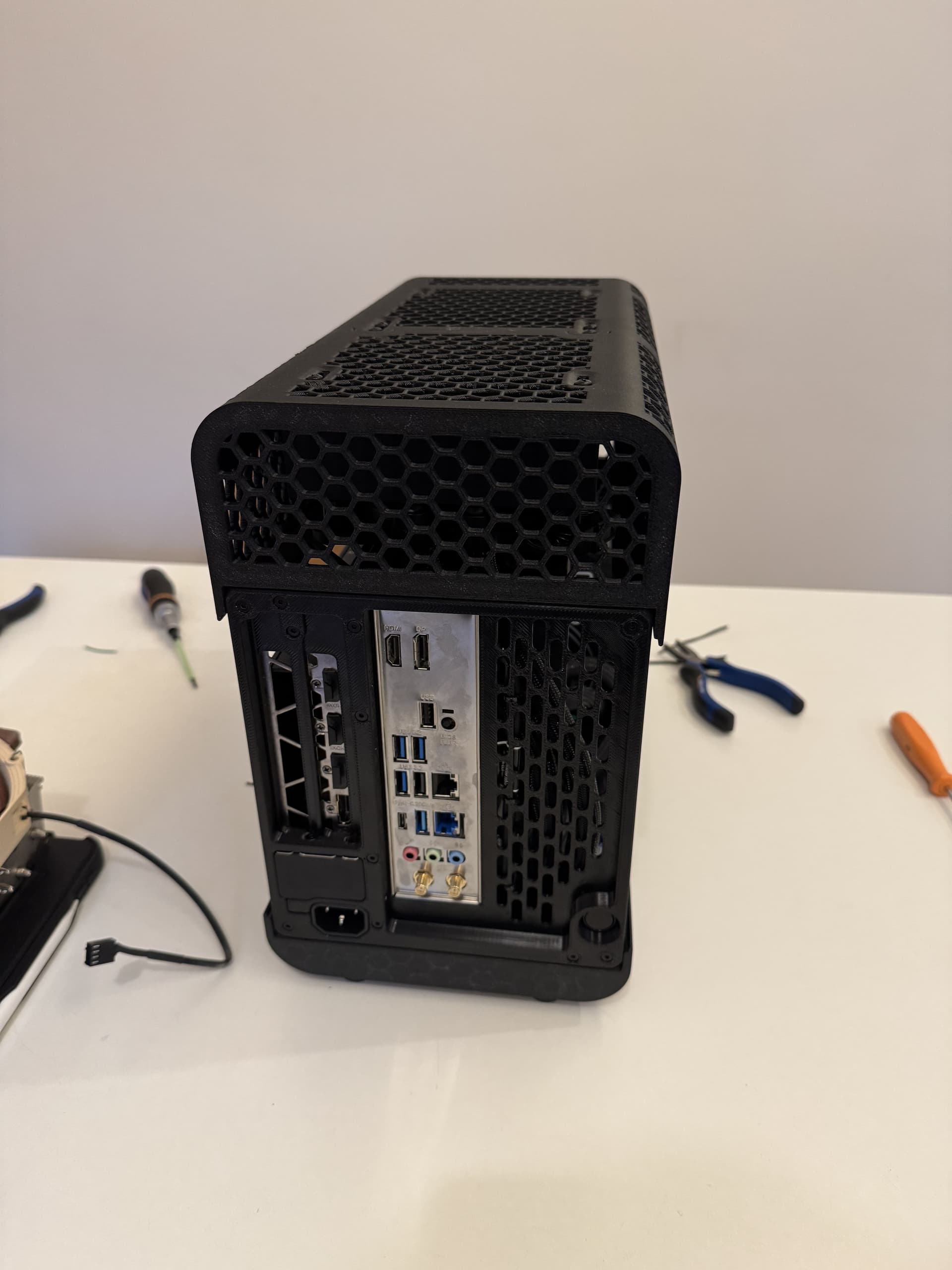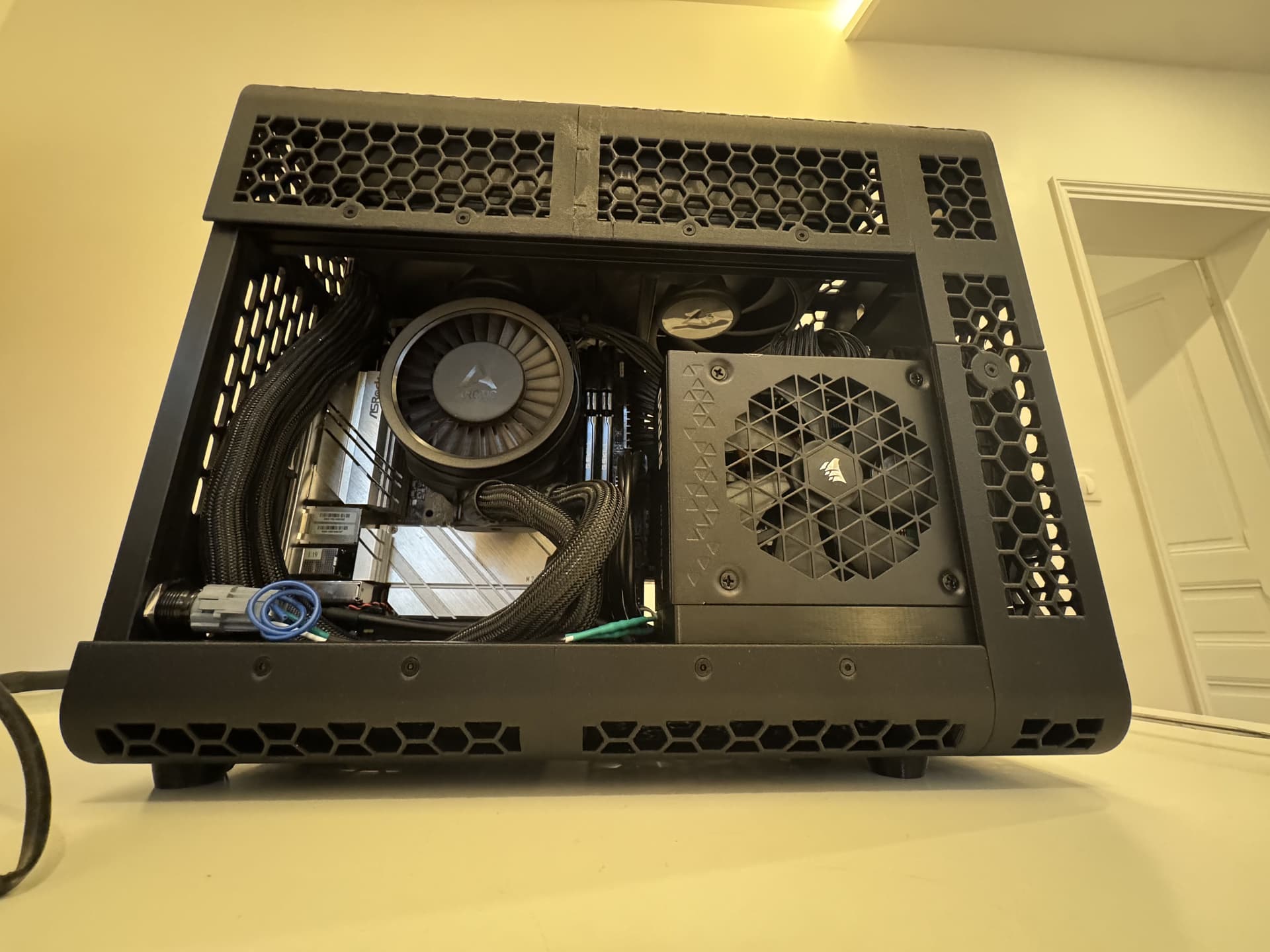 J’étais quasiment au millimètre, et quand j’ai modéliser le boitier j’avais pas les côtes exactes du câble coudé qui fait le pont entre l’alim et la prise en sortie à l’arrière du boitier. Il s’est avéré que le coude en question est trop long pour que le ventillo passe.