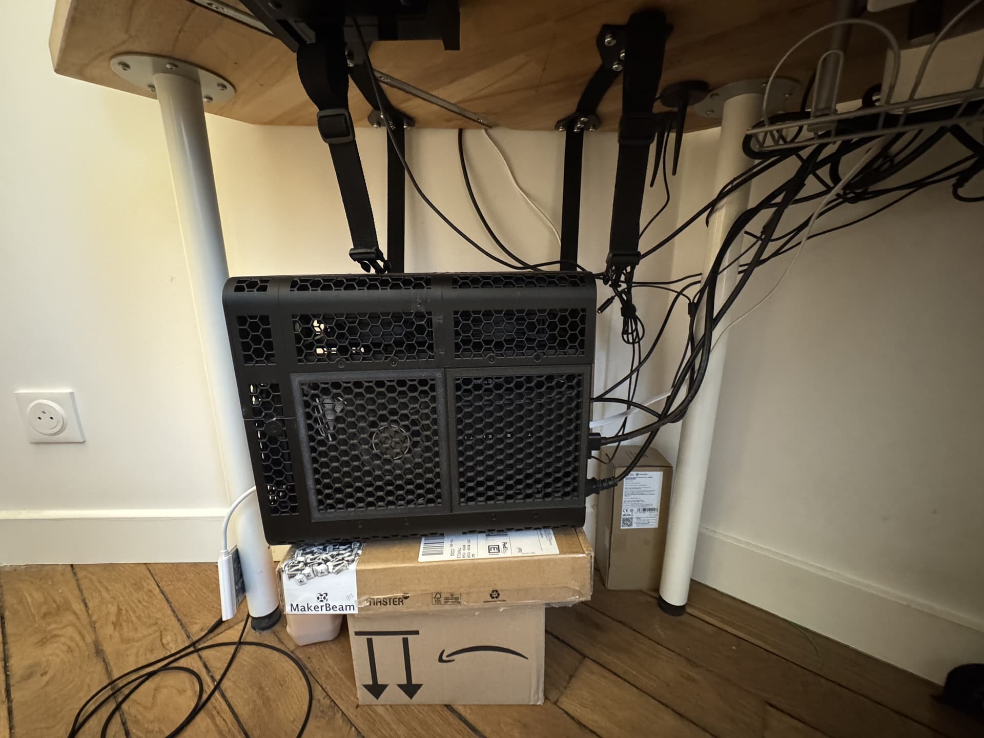 Refaire le support suspendu sous le bureau (d’ou les cartons dégueux et le câbles qui pendouillent)