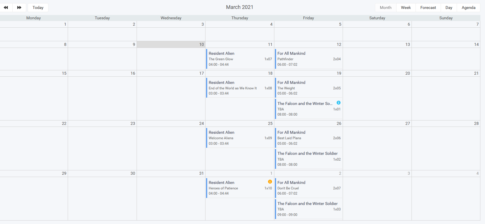Perso j’utilise le calendrier de Organizr qui agrège Sonar et Radarr. J’ai juste config une modif du CSS pour surligner le jour actuel.