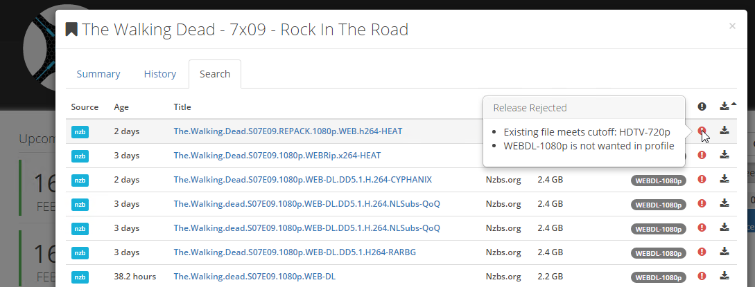 C’est visiblement à cause du fait que l’épisode est sorti à 2h00 et que la sync RSS de rarbg est passé à côté (mon PC n’est pas allumé en permanence, je l’ai booté seulement ce midi). => “Indexer Rarbg rss sync didn’t cover the period between 16/02/2017 22:37:25 and 17/02/2017 02:58:30 UTC. Search may be required.” Une idée pour éviter ça en dehors d’allumer mon PC plus tôt ?