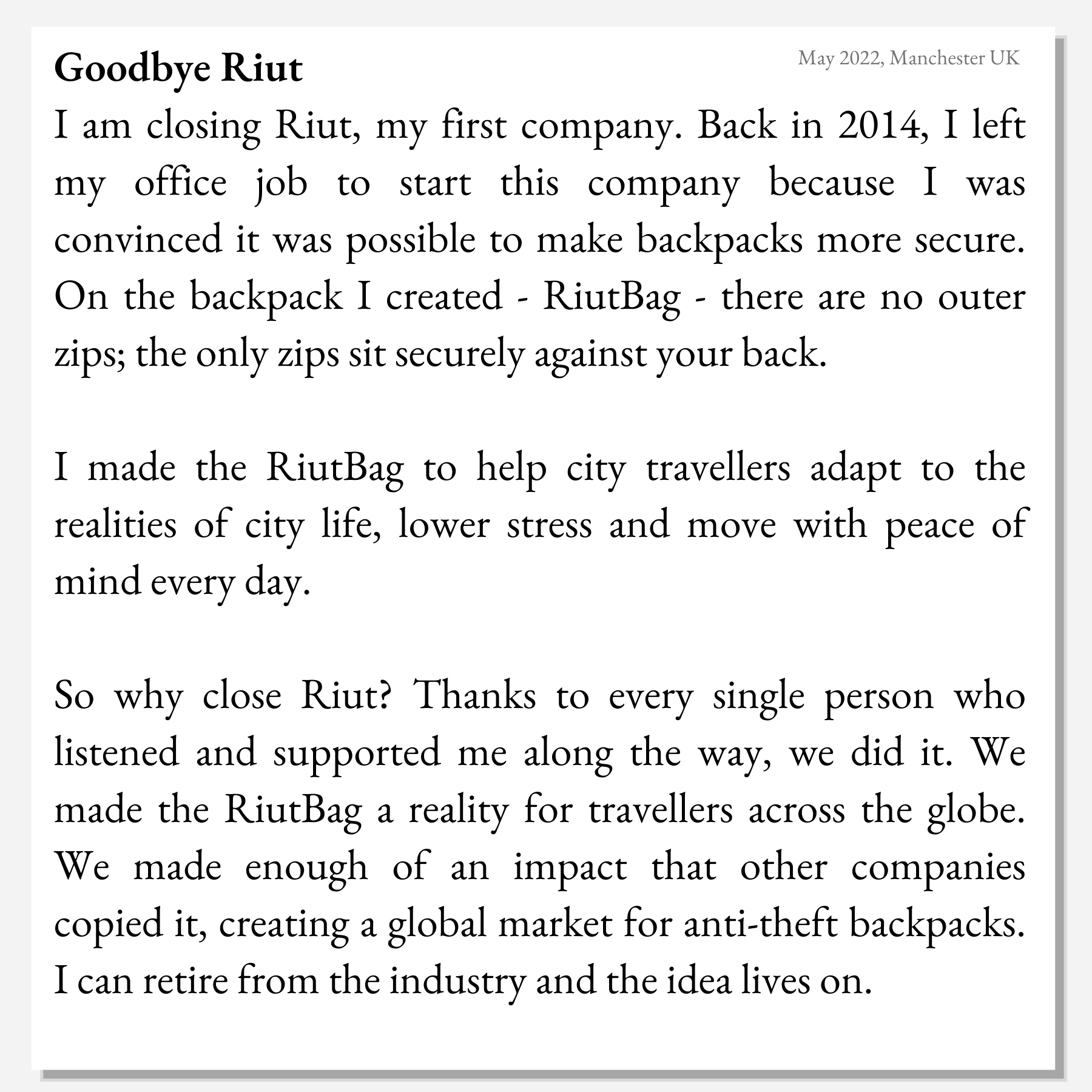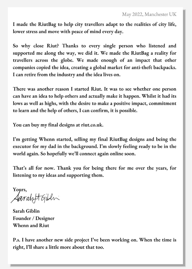Si vous voulez un sac à dos Riut, c’est maintenant ou jamais. La boite va fermer et la dame qui gère ça part bosser dans un tout autre domaine.
