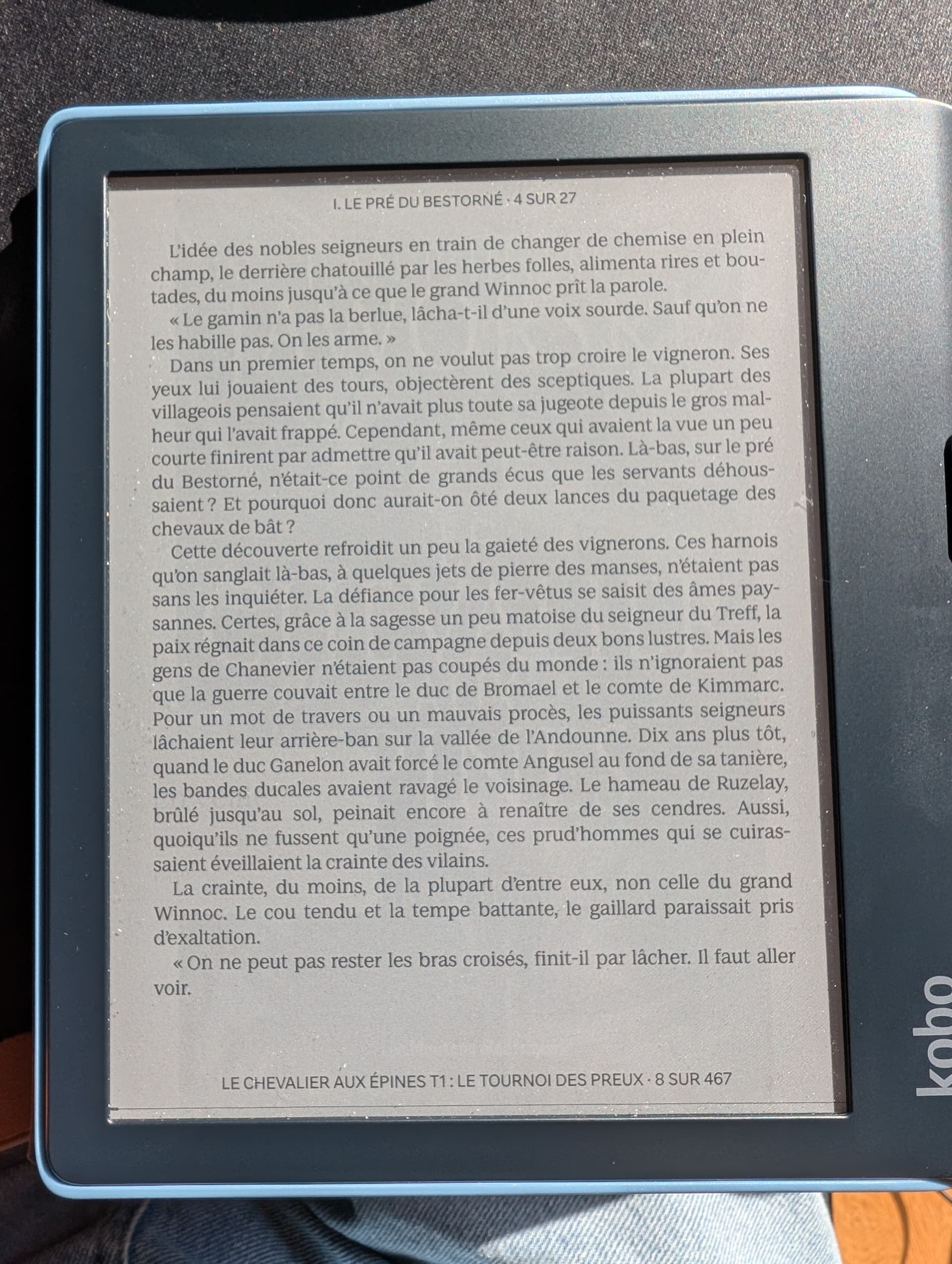 J’ouvre le Chevalier aux épines, des césures partout Je sais pas de quoi ça dépend. Je sais que j’ai des livres achetés chez Kobo, téléchargés direct chez eux. D’autres achetés ailleurs, qui passent d’abord par Calibre pour être convertis en kepub, je sais pas si ça fait une différence là-dessus. En tout cas perso ça m’a jamais gêné, j’y avais jamais fait gaffe