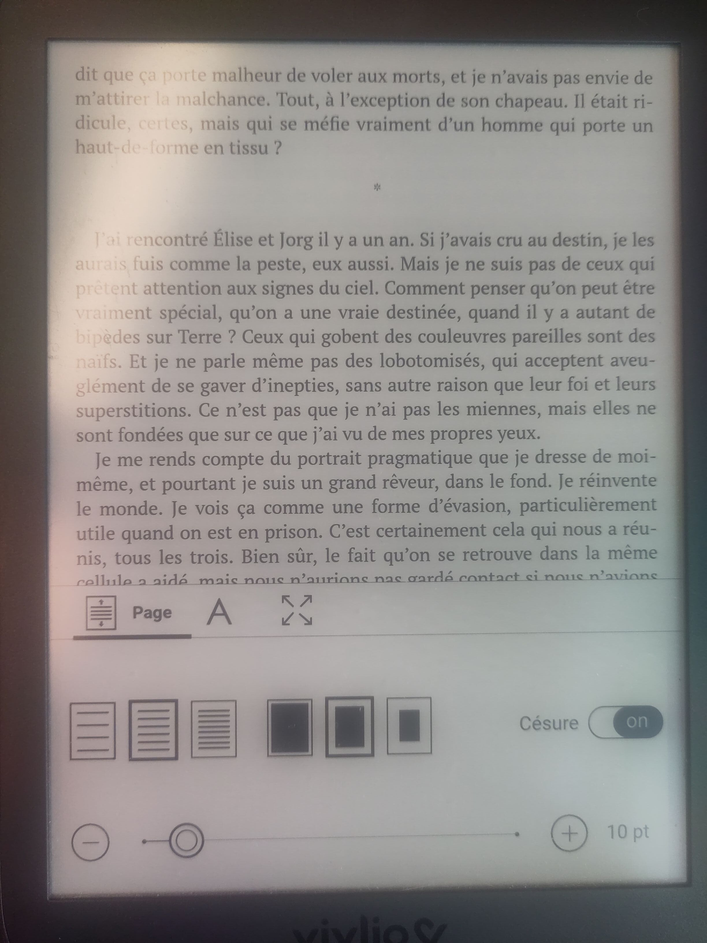 Vivlio InkPad 3 ici, je viens de regarder et j’avais une césure similaire à ta capture, puis j’ai vu dans les options que c’était désactivable. Du coup y’a plus de césure.