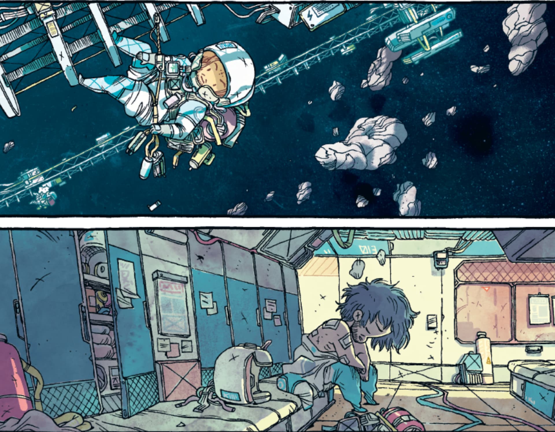 On y suit trois personnages, une scientifique désabusée qui reste à son poste par dépit, une mercenaire qui suite à une épiphanie quitte son job pour faire recycleuse de l’espace et un natif de l’espace contraint de fuir sa station.
