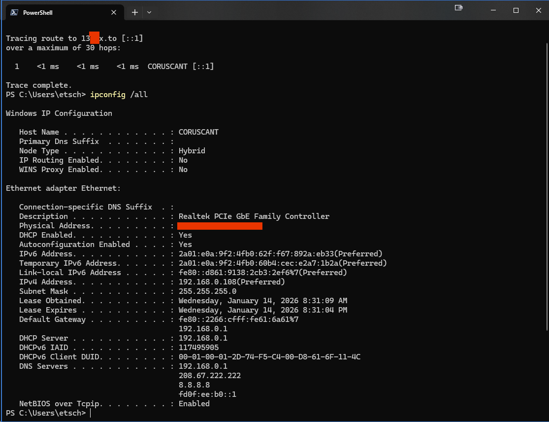 Voici ce que me donne le tracert. Et l’ipconfig associé. Note pour le DNS j’ai mis opendns, et avant j’avais Cloudfare (1.1.1.1), le résultat est identique.