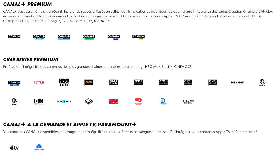 ça fait 4 ans que je suis sur un abo C+ Ciné Séries (avec engagement 2 ans pour gratter un peu sur l’abo) ça faisait le taf mais j’ai amorcé la sortie pour repasser par mon FAI (Free) car avec un déménagement je devrais pouvoir passer de ma freebox mini 4k à la freebox Ultra et le diff de prix de l’abo interner couvrira largement l’abo C+ ou les abo SVoD comprit dans l’offre.