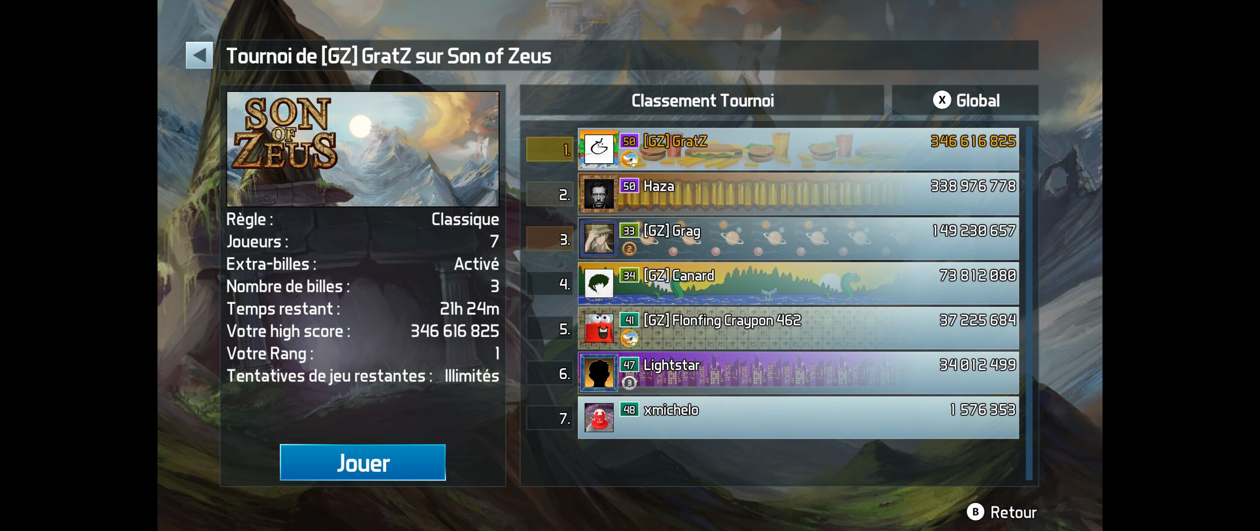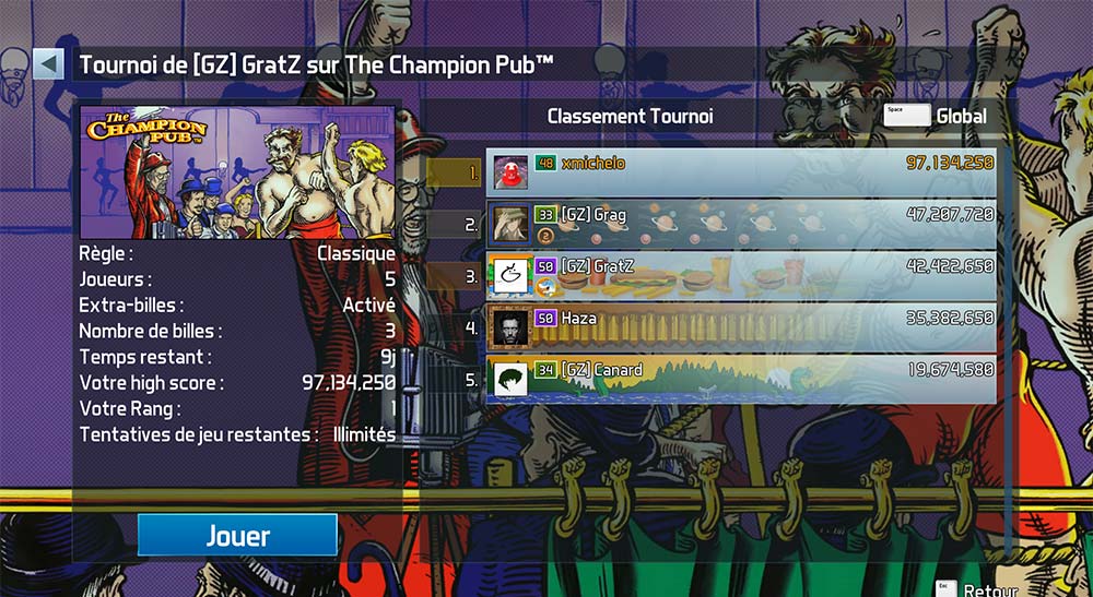 quand on est le champion (on en a battu 4), y’a un mode où tu dois en enchainer 5 avec 5 billes puis, un mode « cash prize », ou tu tapes du 78M environ si tu bats un seul mec, donc ça monte assez vite