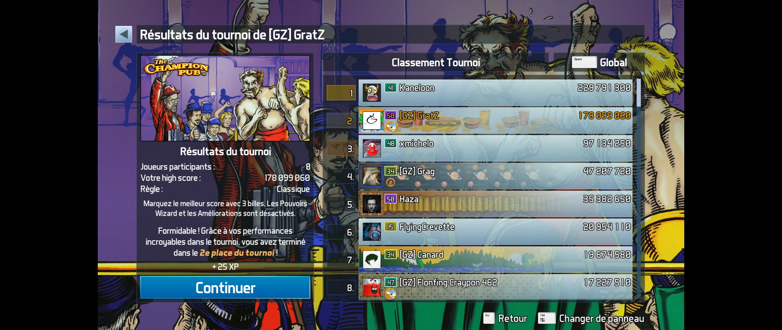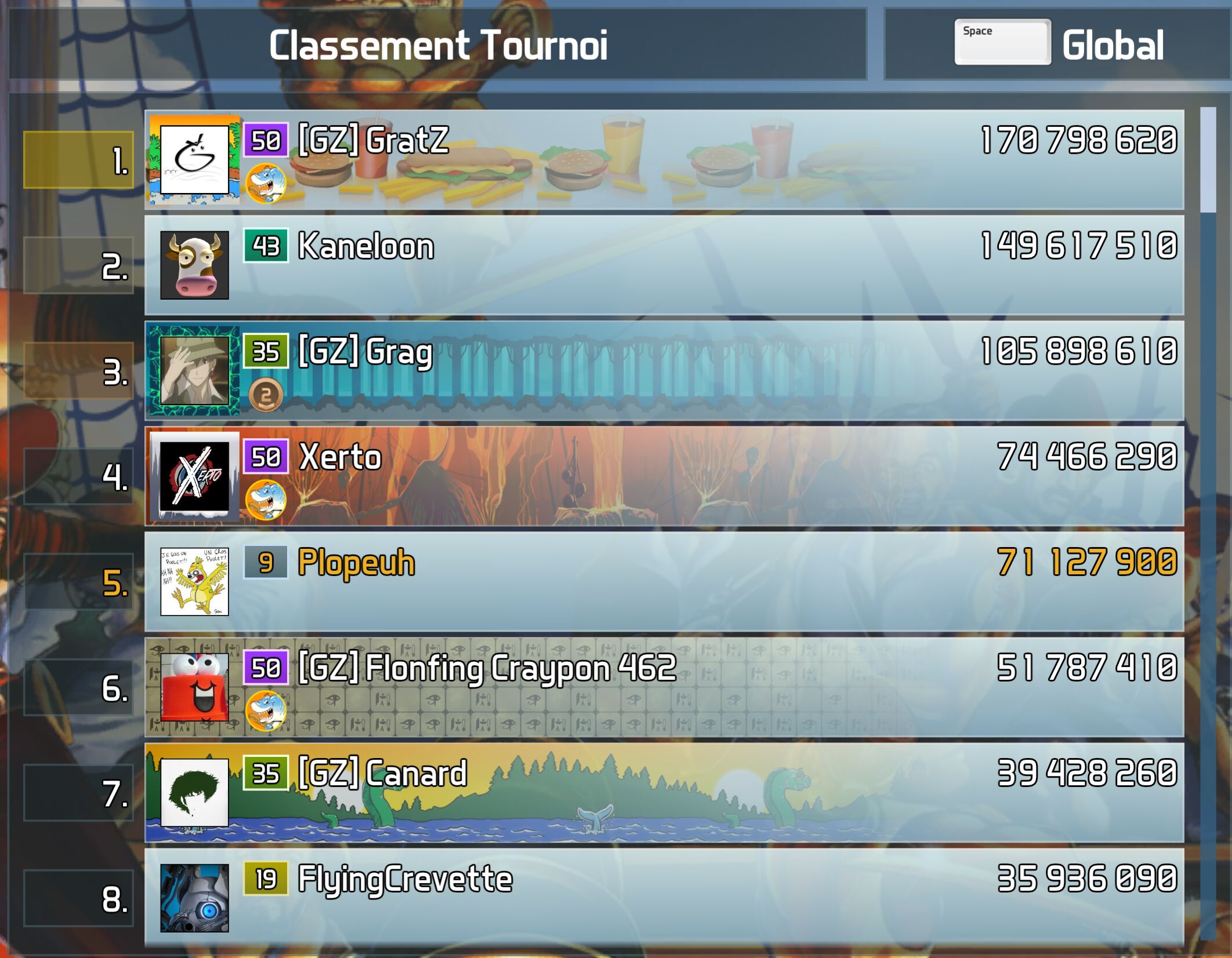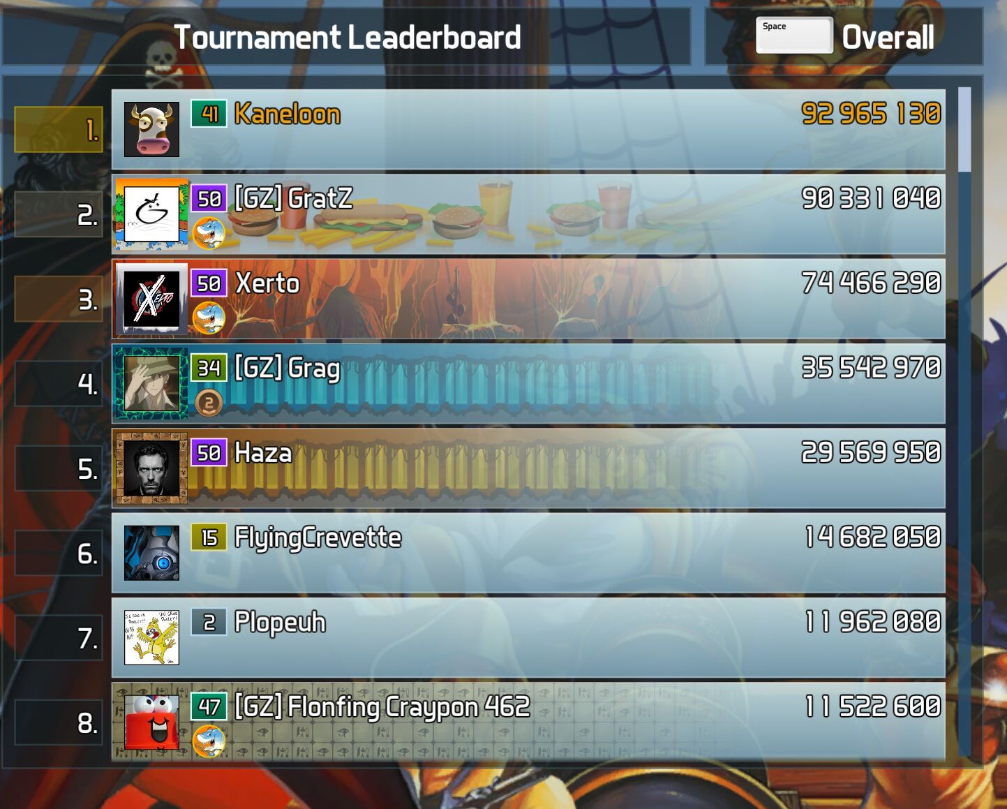 Bon, eh bien c’est pas sans avoir essayé (pas merci à Zen pour ses serveurs en mousse 4h avant la fin du tournoi, je n’ai pas pu voler la victoire !), mais le GG à l’ami @kaneloon pour avoir fait preuve d’une détermination sans faille pour son retour, en l’absence du maître @Haza.