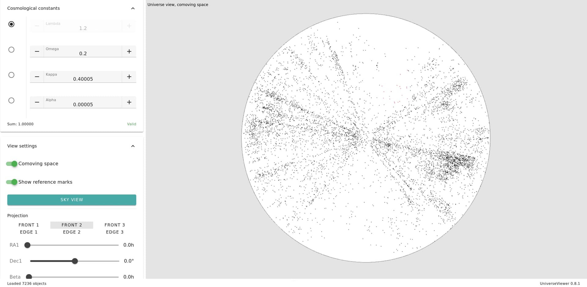 Pour l’instant, nous avons une courbure positive, donc un univers sphérique, car dans la section Cosmological parameters Kappa est supérieur à zéro. La forme que nous voyons représente l’horizon cosmologique.