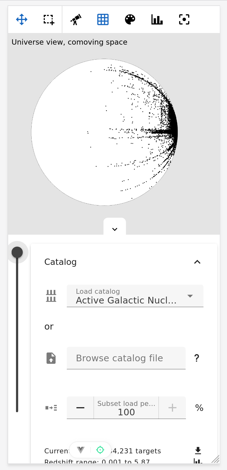Cette application web permet de charger des catalogues d’objets astronomiques (actuellement deux catalogues de quasars, mais d’autres viendront), et de les étudier via des projections sur un plan en fonction de divers paramètres. Nous manipulons des objets 4D (espace + temps) que nous projetons sur un plan (2D).