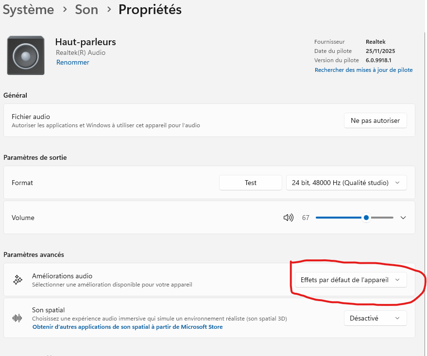 Par défaut, dans la section “Paramètres avancés” - Améliorations audio, c’est “Effets par défaut de l’appareil” qui est sélectionné. cf ci-dessous