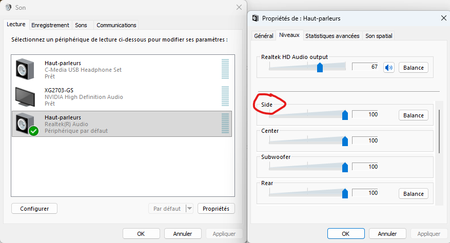 Si j’ouvre les paramètres du périphériques Realtek, clic droit sur le HP dans la barre des tâches → Paramètres Audio → Autres paramètres audio → Haut-parleurs → Configurer