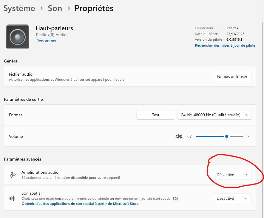 Allez, encore un truc tordu : clic droit sur le HP dans la barre des tâches → Paramètres Audio → Haut-parleurs (Realtek).
